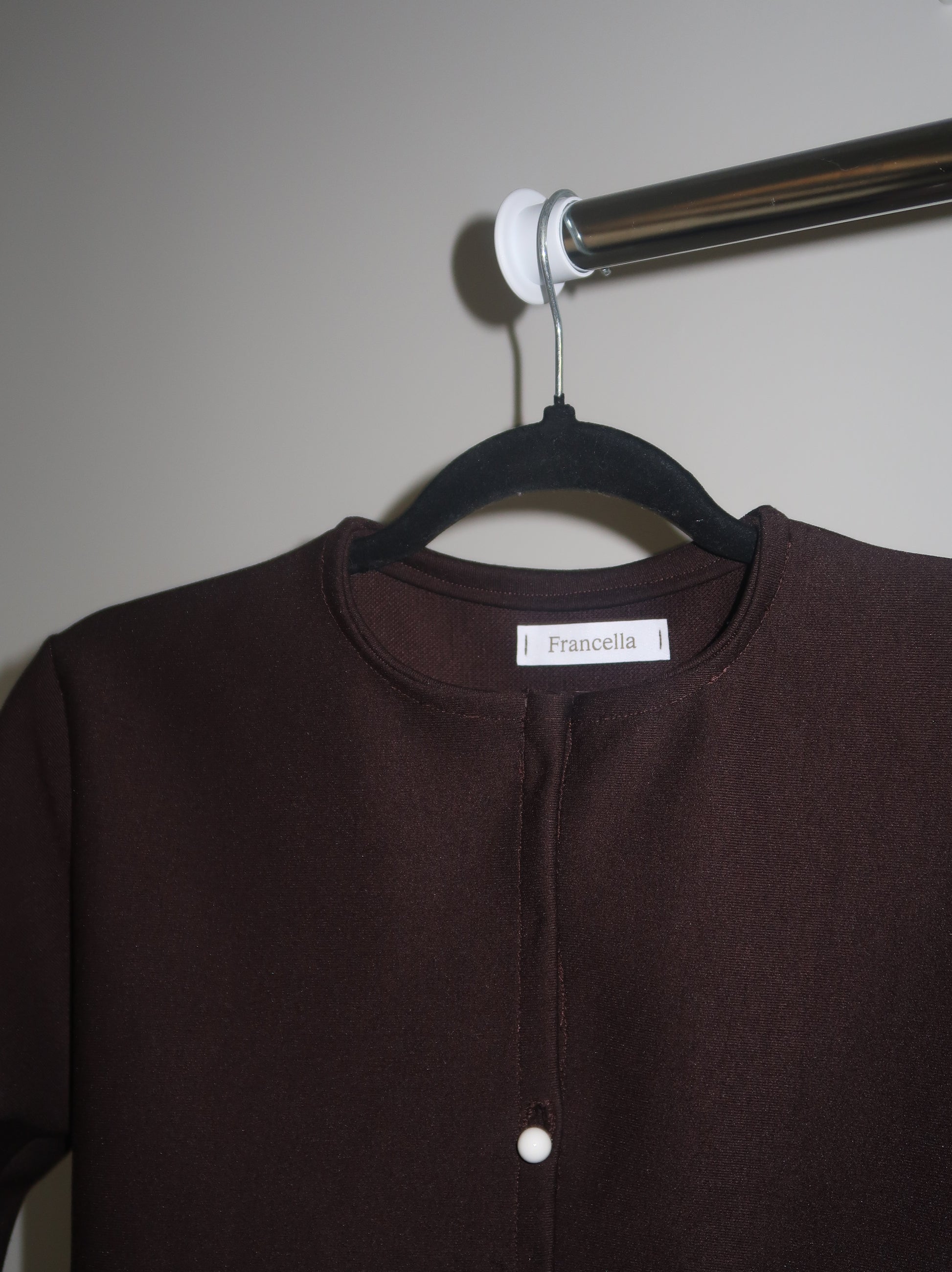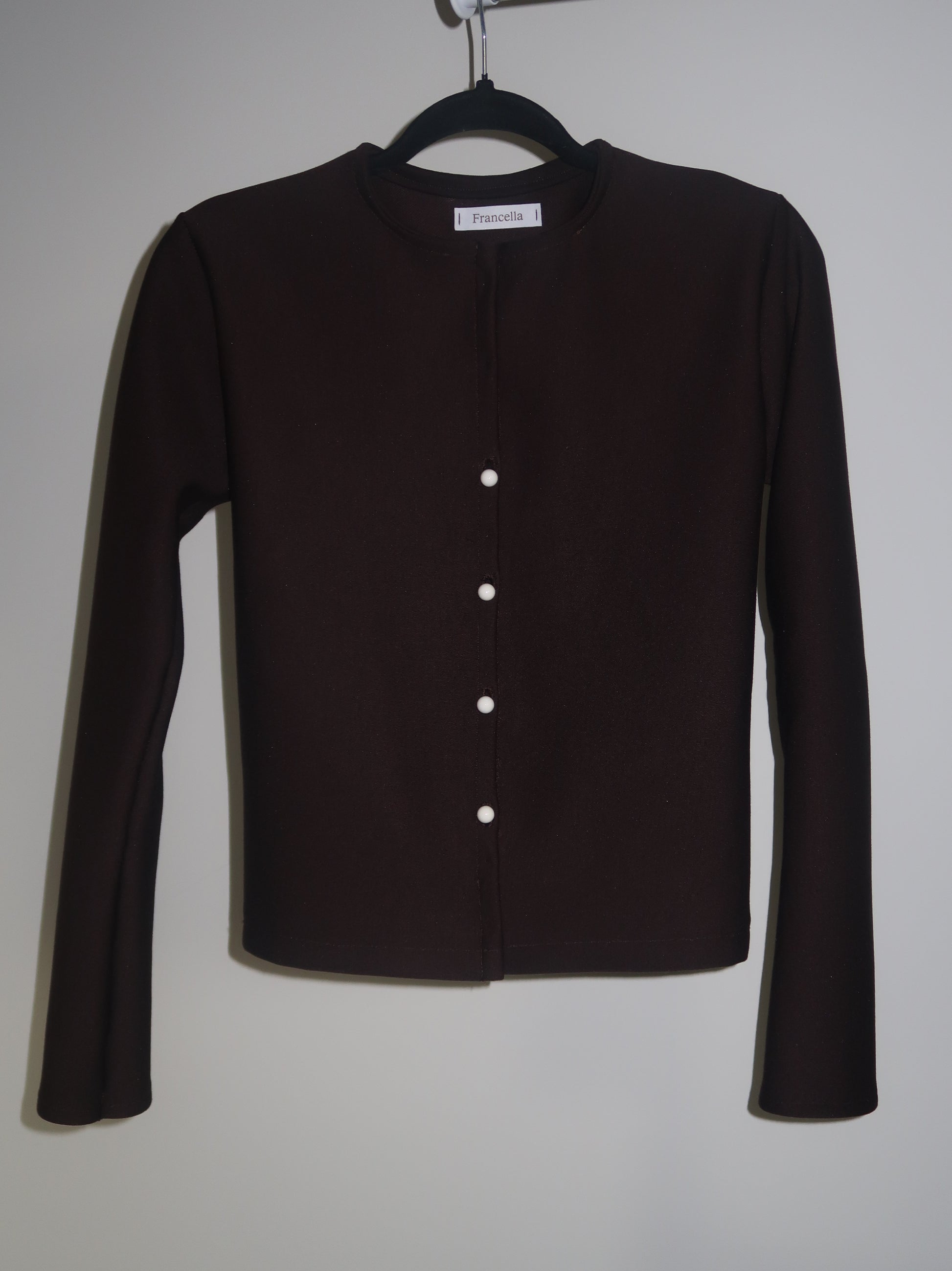 Long sleeve button up cardigan in polyester and viscose pique knit, model wearing size small.